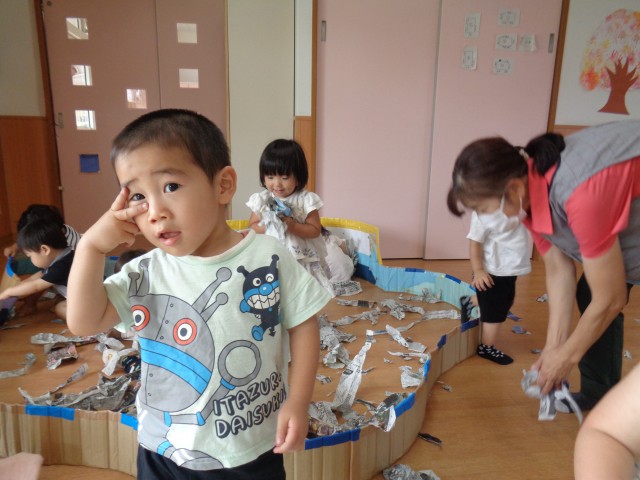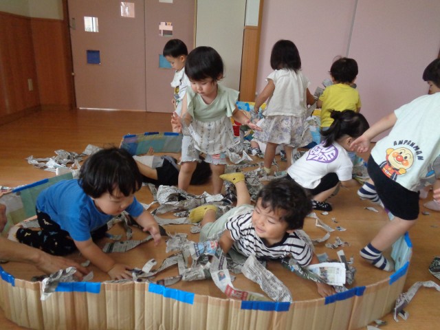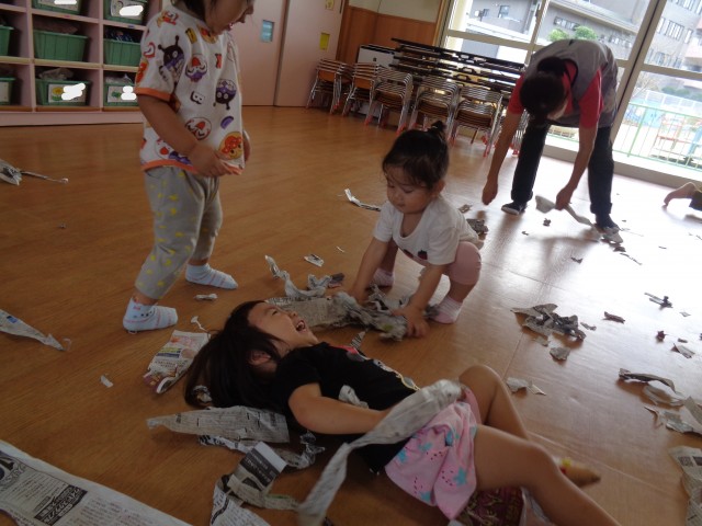 避難訓練に参加した後、保育室に戻って新聞紙遊びをしました。