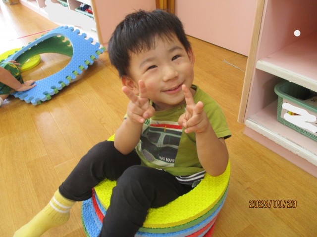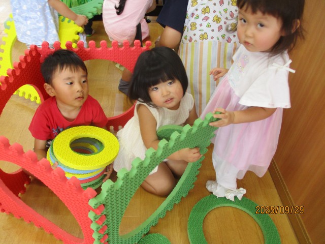 遊び始めると、丸型を重ねて椅子にしたり、みんなで協力して家を作ったりと楽しんでいました♪