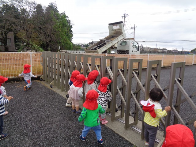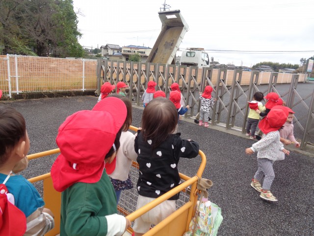 歩いていくと、テラスで遊んでいるときにいつも見えるショベルカーやトラックを発見!近くまで行くと、トラックが動き出し、その様子を特等席で見ることができました♪子どもたちは「うわー!」と目をキラキラさせて大喜び!「やったー!」とジャンプする子や、拍手をする子など嬉しさを自分なりに表現していて可愛らしかったです☺