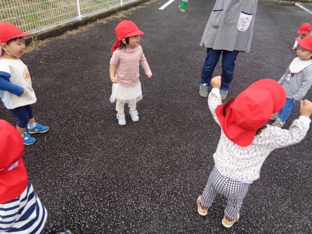 園庭でダンスの練習をしました。外でのダンス練習は久しぶりだったのですが、音楽がかかると大きな声で”エル・オー・ブイ!”と掛け声を言うことが出来ました。隊形移動もほとんどの子が笛の音をよく聞いて自分から進んで移動出来ていました!なかには、「前に行くよ!」「もっとこっちきて!」と友達同士で声を掛け合いながら移動をする姿も見られました♪