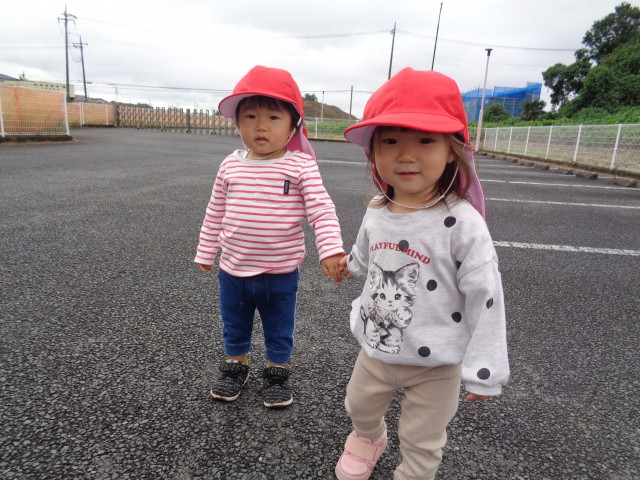 友達と手を繋いで一緒に歩いていきます♪月齢の低い子たちは散歩車に乗って一緒に行きました!