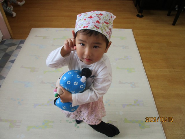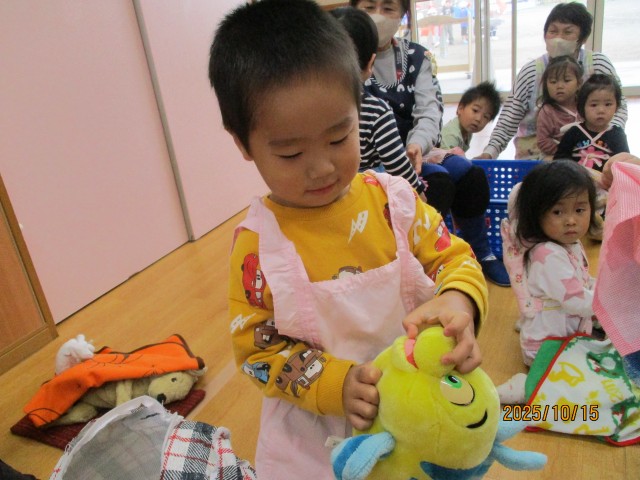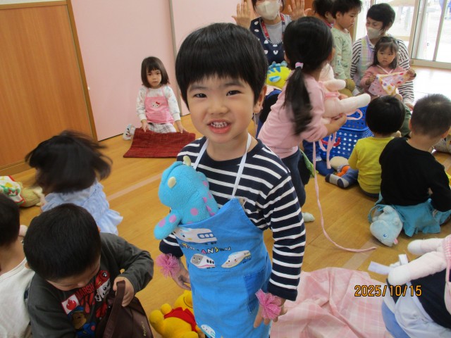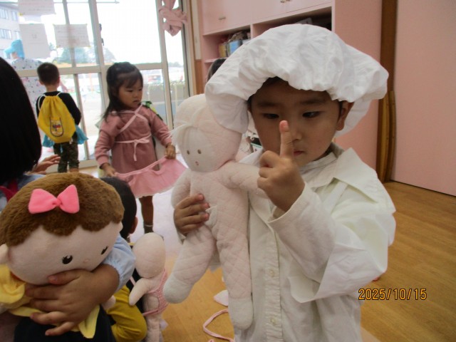 お人形遊びをしました。お気に入りの人形を選び、中には片付けの時間まで同じ人形を大切に持つ姿も見られました♪