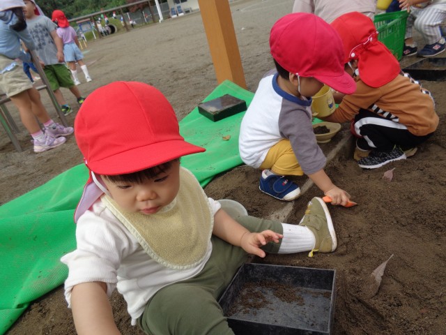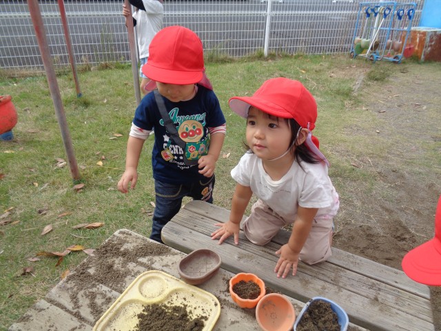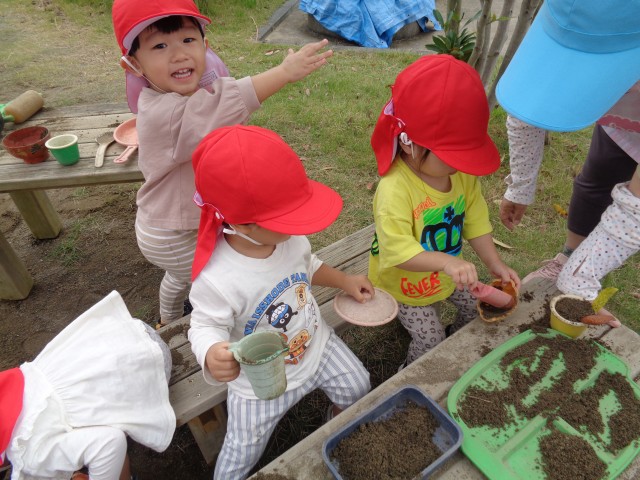 砂場遊びは久しぶりだったからか、子どもたちは長時間集中して遊んでいました!以前遊んだ時よりも手に力が入るようになり、砂で重いバケツも軽々と運んでいましたよ♪友達と一緒に椅子に座って遊んでいる姿はとても微笑ましかったです☺