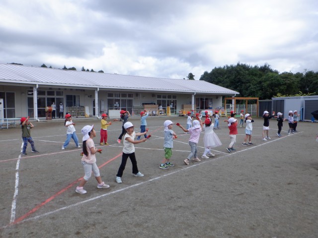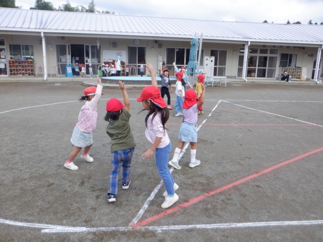 ラジオ体操、ディズニー体操をしました。ラジオ体操は明日の運動会でも行うことを伝えると、「頑張る‼」とやる気満々の様子で元気に体を動かしていました。ディズニー体操はみんなが大好きな体操なので、保育士の真似をしながらニコニコ笑顔で踊っていました♪