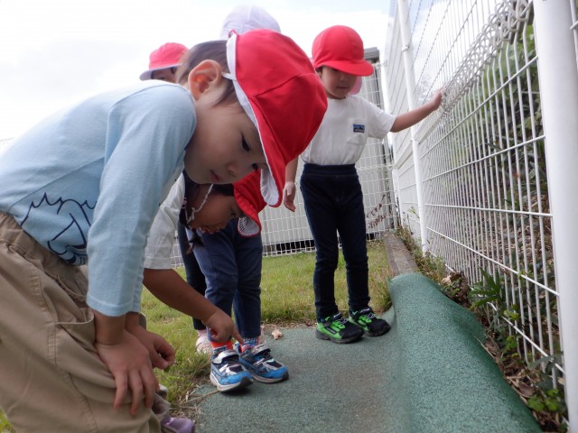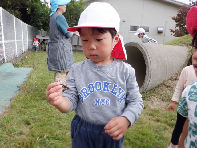 誰かがカマキリやクモなどの虫を見つけると、、、、「どこどこ⁉」と皆が集まり夢中で動く様子を見たり手で触れて見たりしていました。
