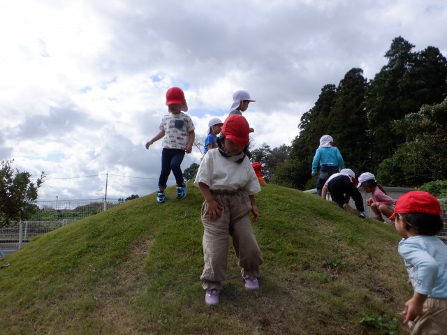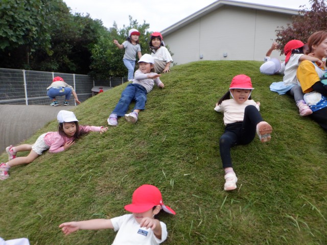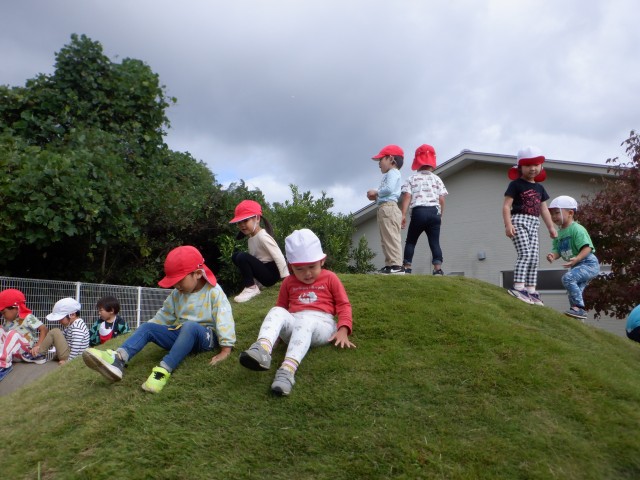 保育士が「遊んでどうぞー‼」と声を掛けると、一斉に山へ走り登り下りする子どもたちで、沢山体を動かしながら伸び伸びと遊んでいました。
