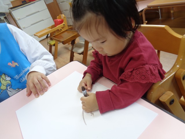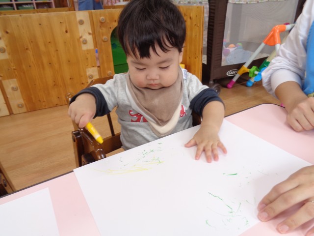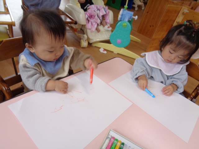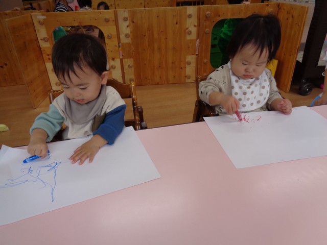保育士が”どんな色がすき?”と歌いながらクレヨンの箱を見せると、皆好きな色を指さして選ぶことが出来ました。