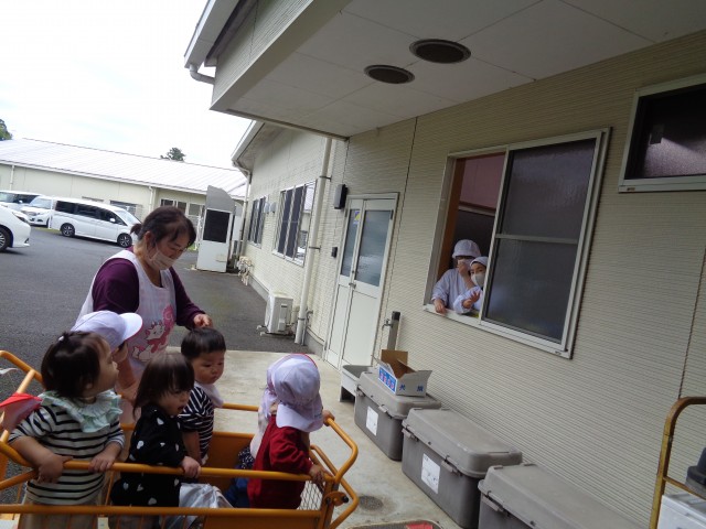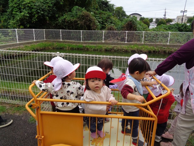 月齢の低い子は、散歩車に乗ったり、二人組で手を繫いだりして職員駐車場を散歩しました。
