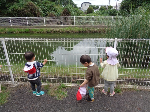 その後は、給食の匂いにつられて給食室の裏を回って園内散歩に行きました。給食室に到着すると「今日カレーでしょ!」「早く食べた~い」「給食待ってます!」と大興奮でした。虫や落ち葉を探したり、貯水池を観察したりと楽しい散歩の時間を過ごすことが出来ました☺