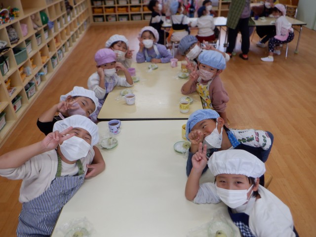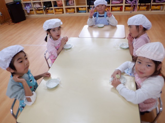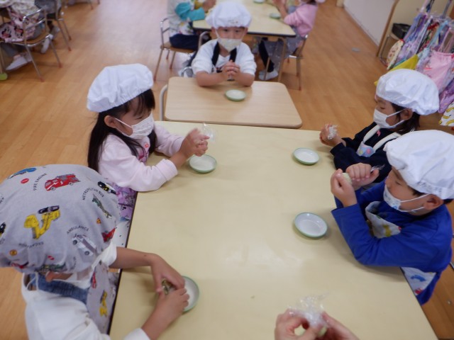 少しずつ柔らかくなり固まってくる様子を興味津々で見る子どもたちは「美味しそうだねー♡」と友達と嬉しそうに話していました。