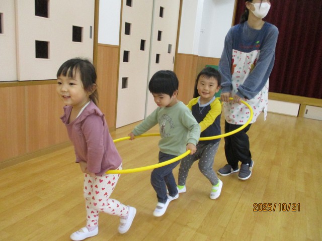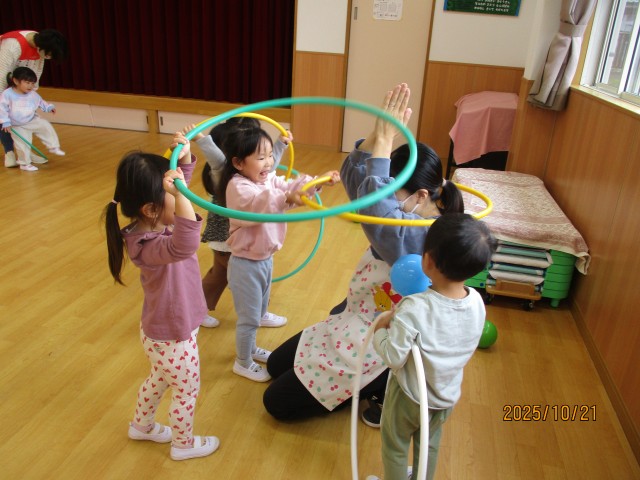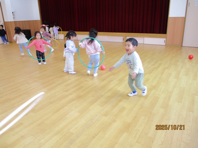フラフ―プを繫ぎ合わせて電車にしたり、輪投げをしたりして楽しむ姿が見られ、とても可愛らしかったです!また、ボール遊びでは、友達と投げ合ったり、サッカーのように蹴ったりして遊ぶ子どもたち♪「こっちだよー」「もういっかい!」と話をしながら終始、夢中になっていました☺