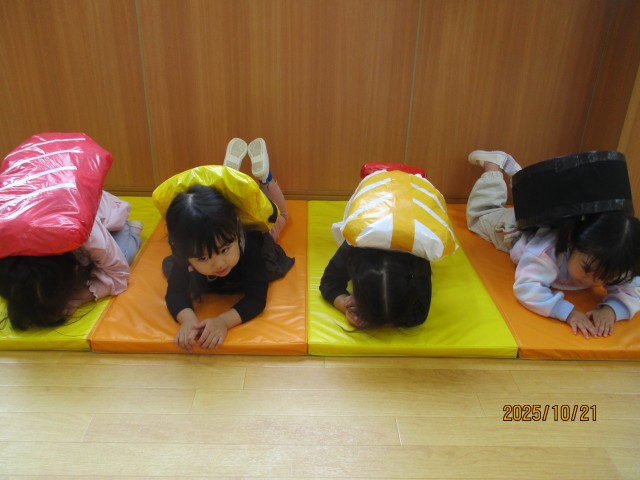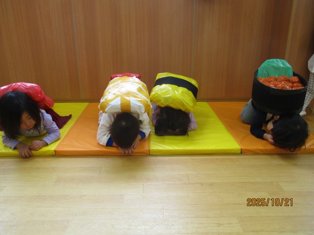 「いくらがいいな~」「えびにしよっと!」とそれぞれ好きなおすしを選び、嬉しそうしていた子どもたちでした☺