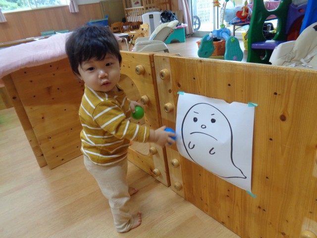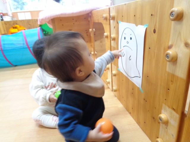 ”おっ!おばけ”の手遊びが大好きな子どもたちです。おばけをつい立てに付けると「あ!!」「あった‼」と指差して知らせてくれる子どもたちでした☺