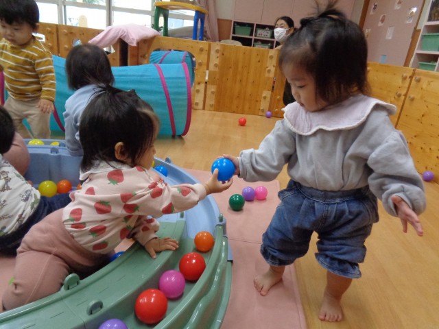 「どうぞ」とお友達にボールを渡して関わり合う姿が見られるようになってきました。