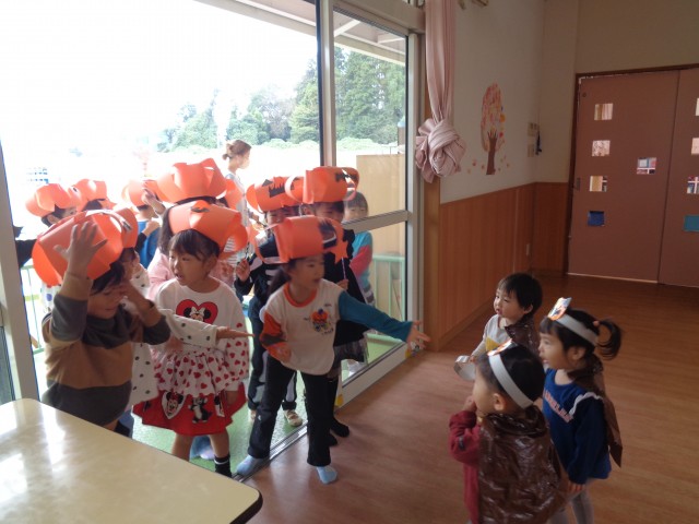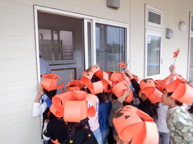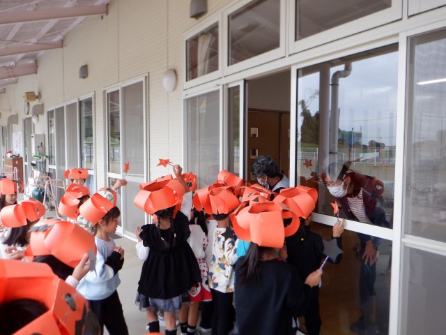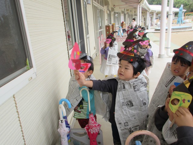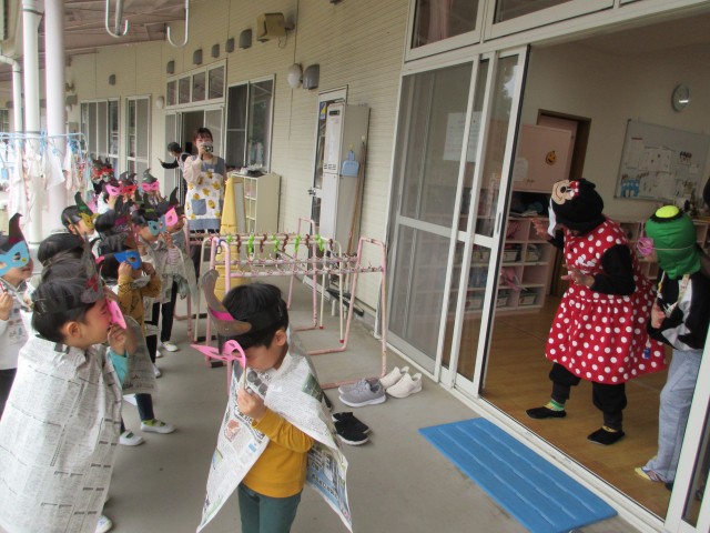 仮装が出来たらみんなで園内を散歩しました。他クラスのパーティーの様子を見に行ったり、事務室や給食室の先生に挨拶に行ったりしました。