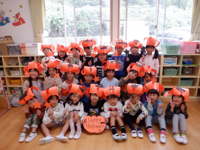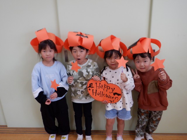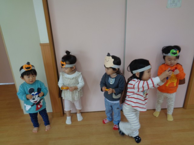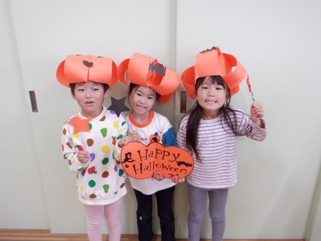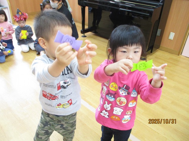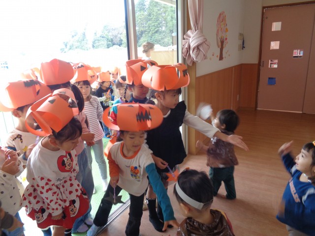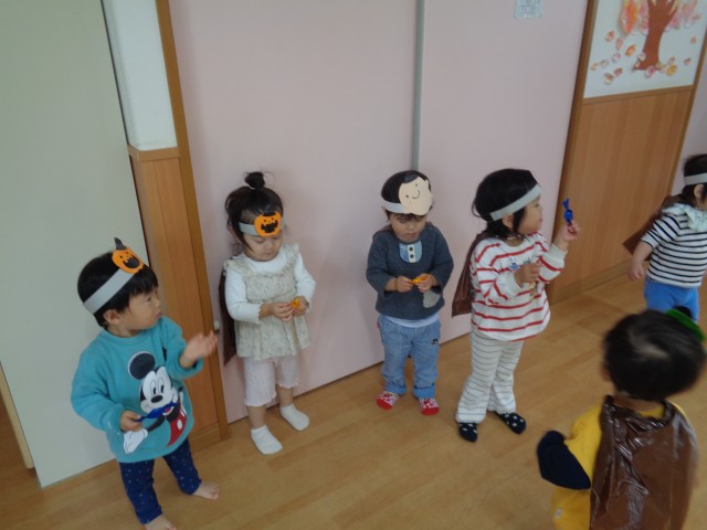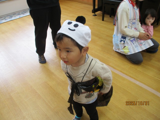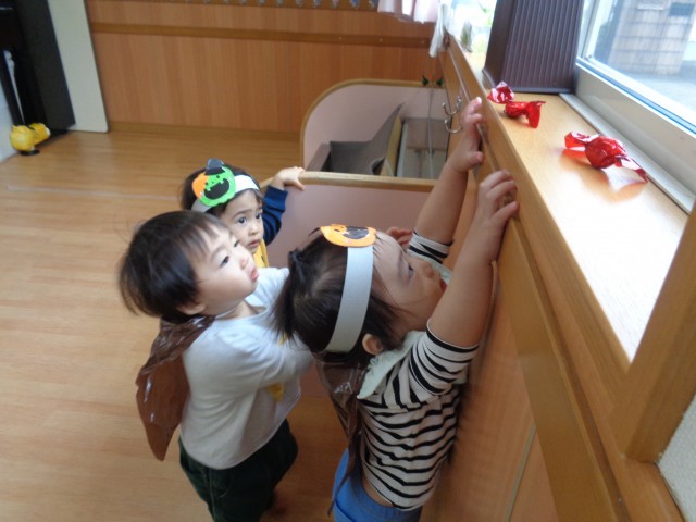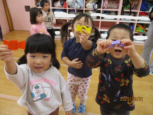 保育室に戻ったあとは、一人一人”トリックオアトリート”と保育士に言ってキャンディー(折り紙)を貰うことができ、とっても嬉しそうでしたよ☺