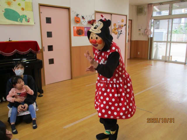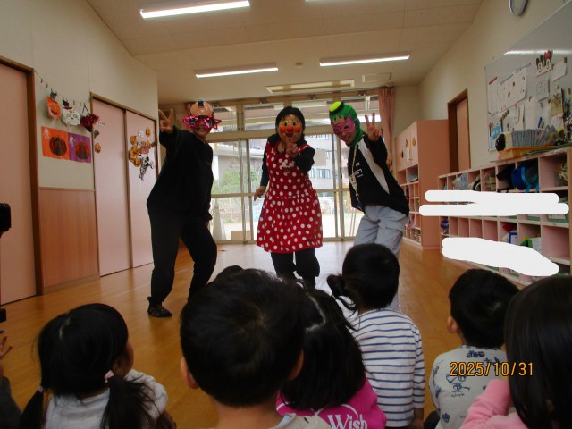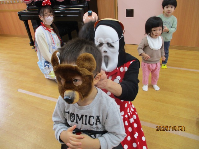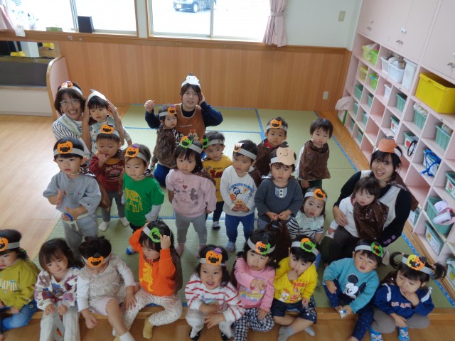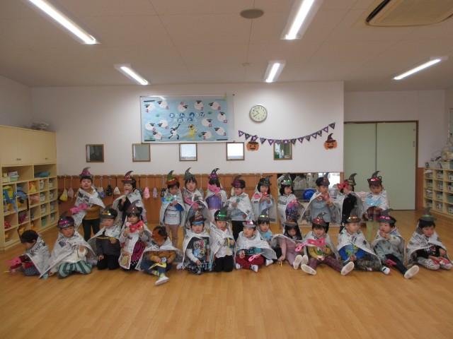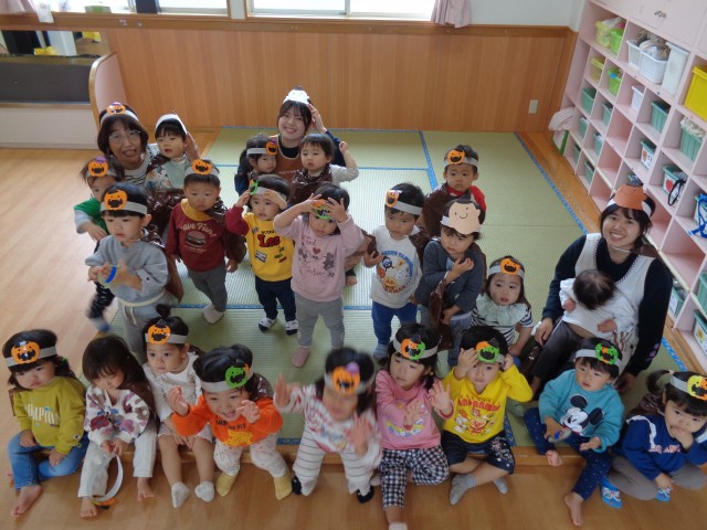 ハロウィンパーティーをしました♪保育士の仮装をお披露目!!不思議そうな表情で見つめる子どもたちでした!中には、誰だかわからず泣き出してしまう子も…怖くないと分かると表情は引きつりつつ、ハイタッチをすることができました♪