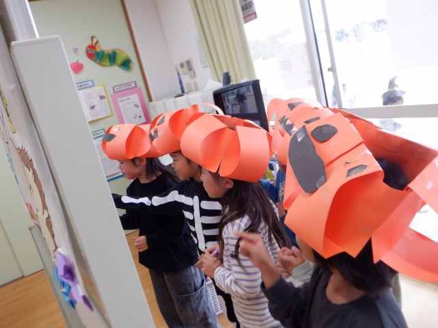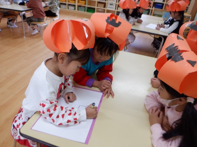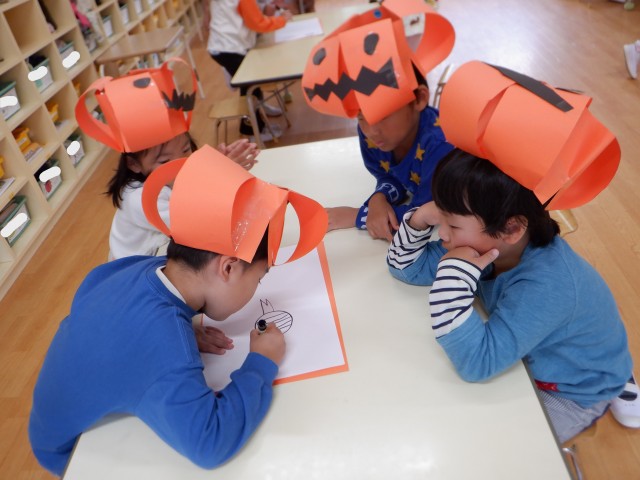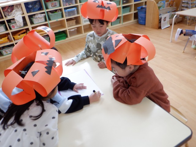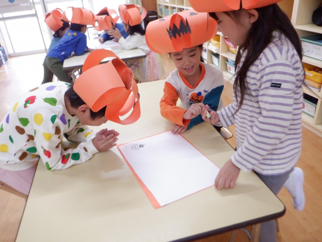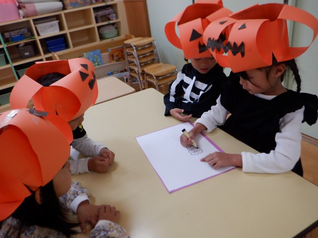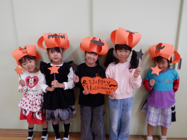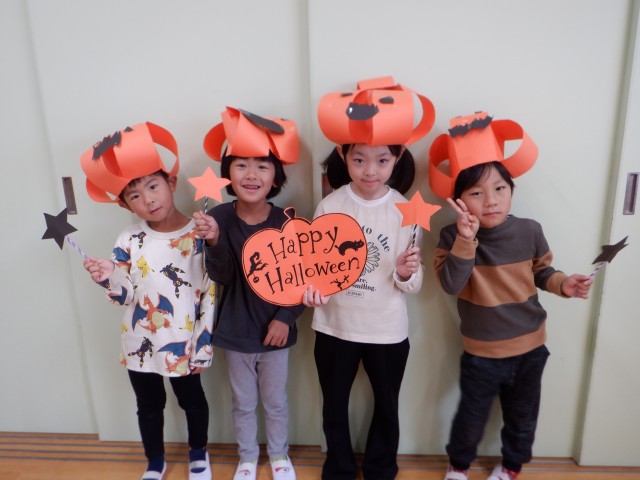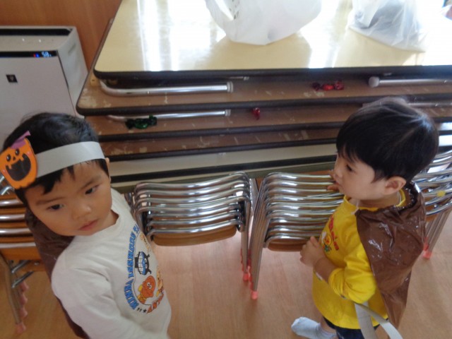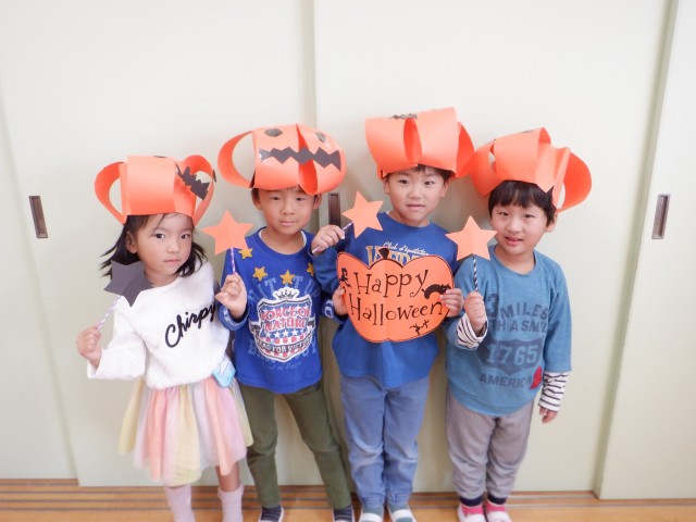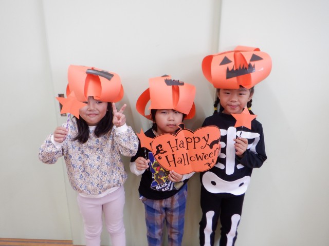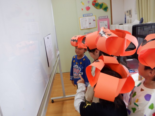 活動前にハロウィンの絵本を見ていたので、「なんて言ってお菓子をもらうの??」と聞くと「トリックオアトリート!!」と答えられる子も中にはいました!!
