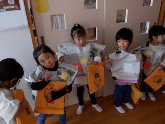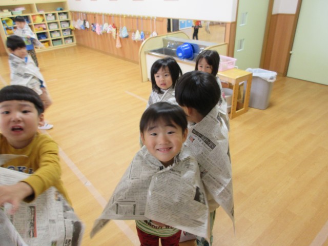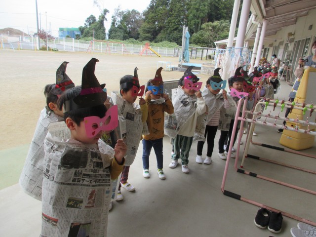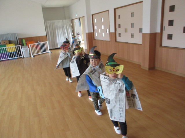 まずは昨日作った帽子と仮面を付けたり新聞紙でマントを作ったりして仮装をしました!