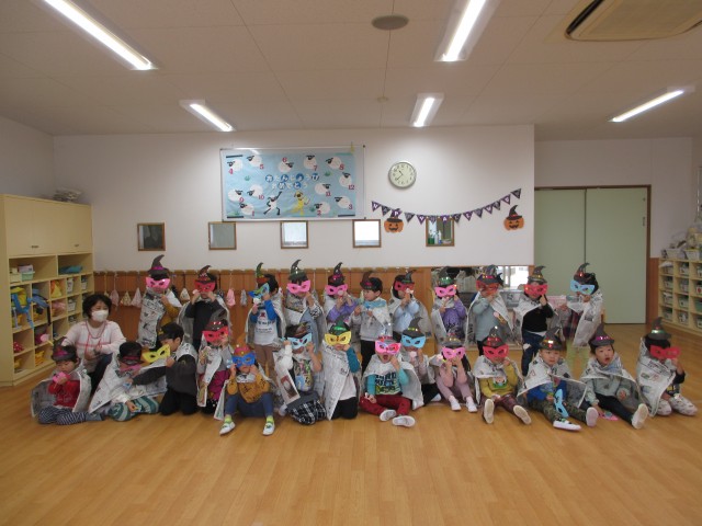 自分で作った洋服を着て、ホールでおばけ探しをしたり、ゲームをしたりしました。
