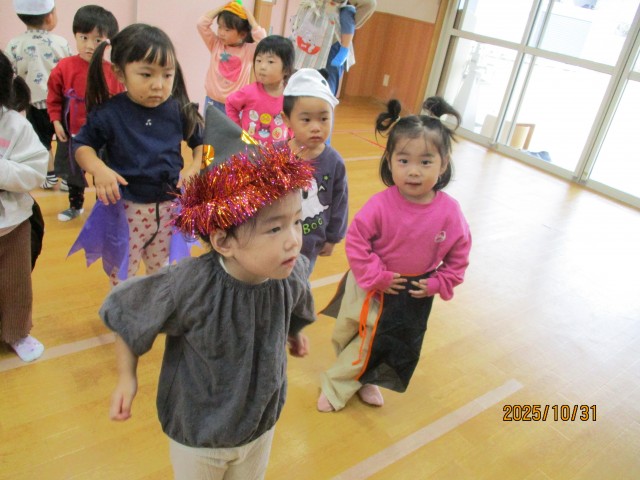 キャンディー探しを終えた後は、こどもたち数人ずつ仮装をしながらダンスをしました♪嬉しそうに身に付けながら踊る姿がとても可愛らしかったです♪