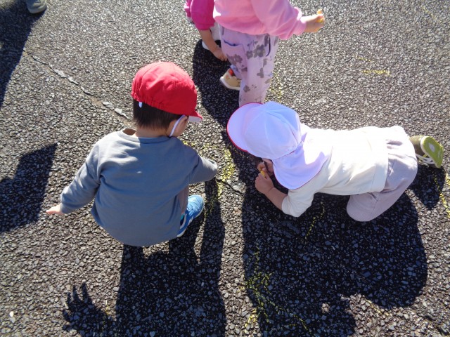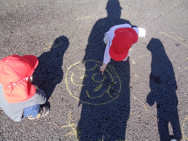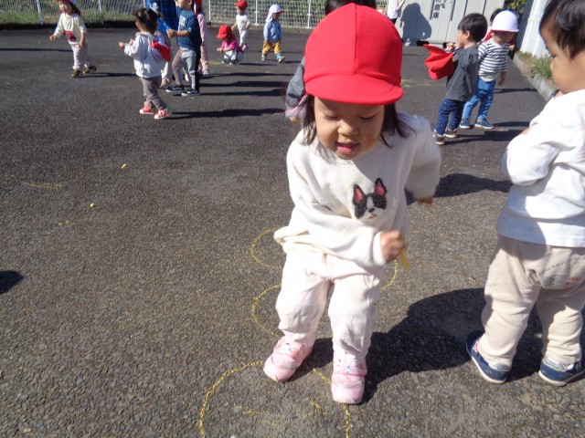 けんけんぱが出来るように、〇を描くと、子どもたちも気が付いたようで、「けん、けん、ぱ!」とジャンプして楽しんでいました♪上手にジャンプできていましたよ☆