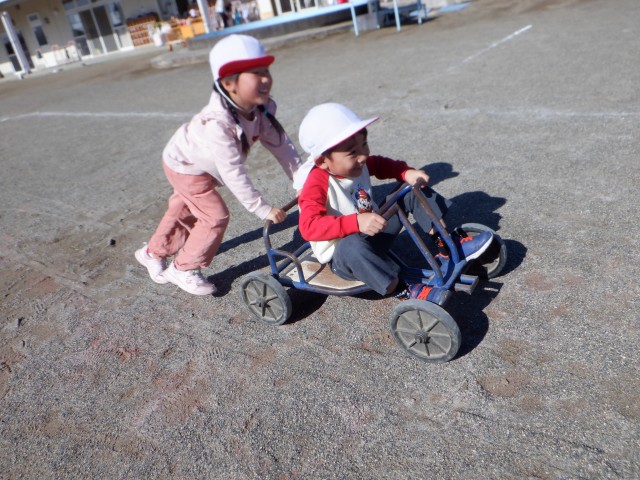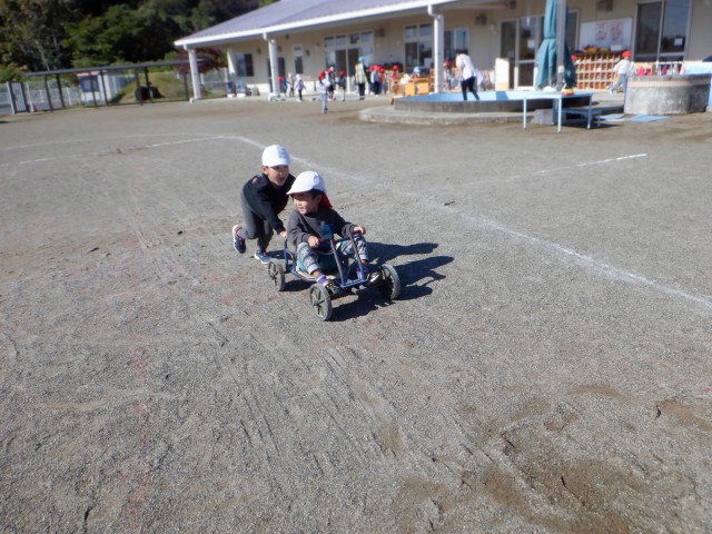 ゴーカートでは、2人組になって押す人と乗る人を決め、行きと帰り交代で競争しました。