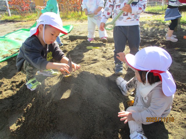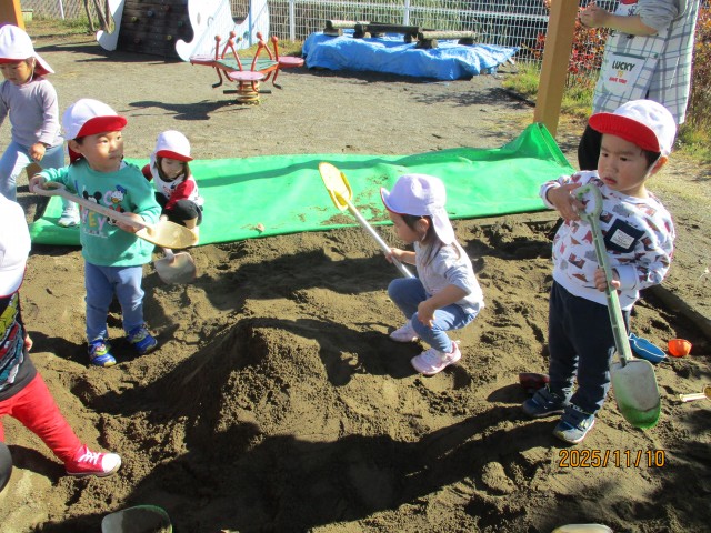 砂場遊びをしました。今日は、保育室など朝から普段と違い、緊張した表情の子どもたちでしたが砂場に行くと嬉しそうに遊びはじめるもも組さん。