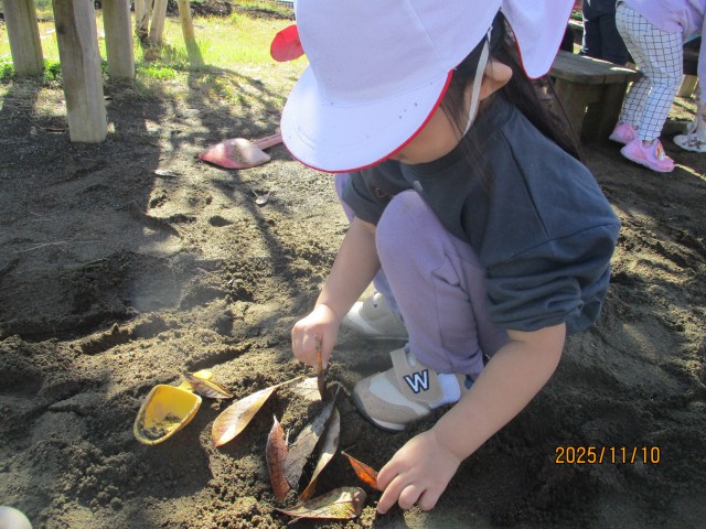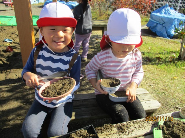 「こうかな、、?」とスコップを使い丁寧に入れていました。「とがった方が上だよね‼」と置く方向を気を付けながら行っていました♪