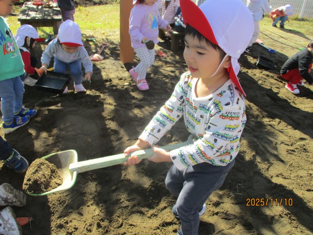 中には、遠くから土を掘っては運ぶ働き者のもも組さんもいました♪