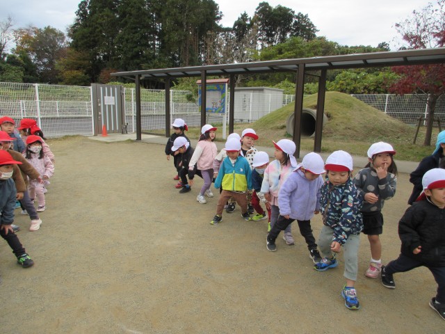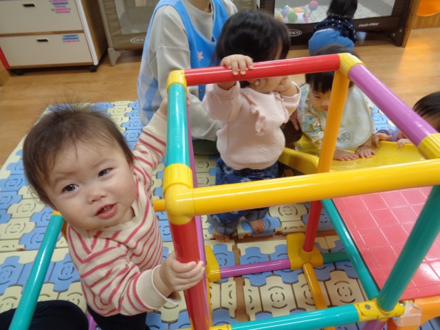 おにぎりベンチの周りグルグルグルと伝い歩きを楽しむ子がいました。それが楽しそうに見えたのか徐々にお友達が沢山集まり皆でグルグルと伝い歩きを楽しむ様子が可愛らしかったです。