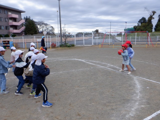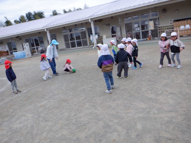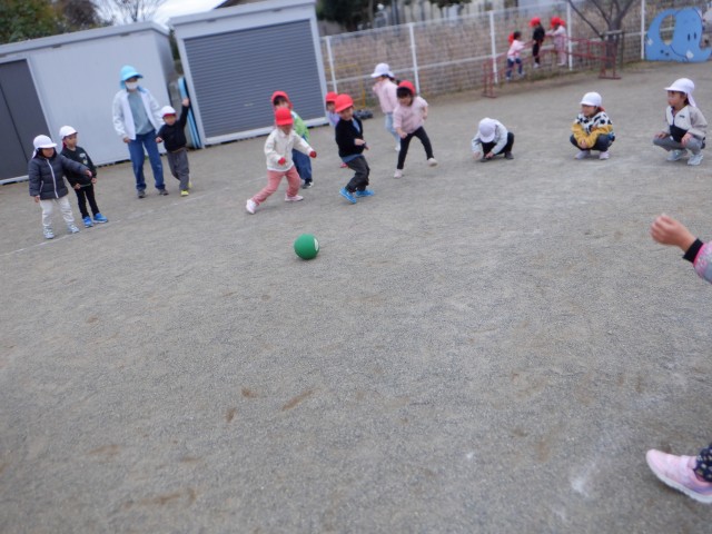 ボールを転がすまでに中にいる子が逃げて、なかなか当たらず外にいる子は苦戦していましたが、ルールを理解しゲームができました。