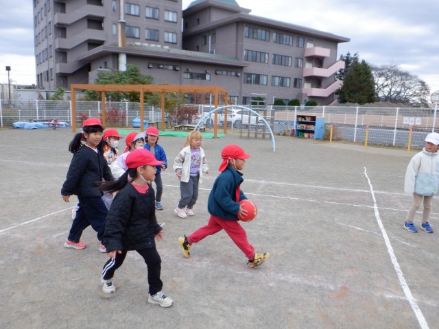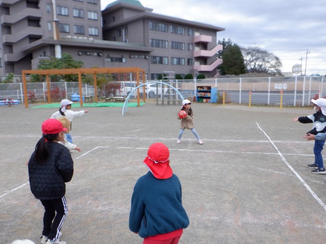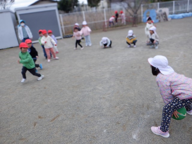 最近「今日はなにしたい?」と聞くと、声を揃えて「ドッチボール‼」と言うこどもたち。戸外遊びでのブームになっています♪