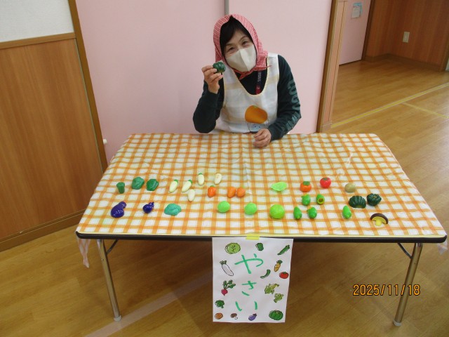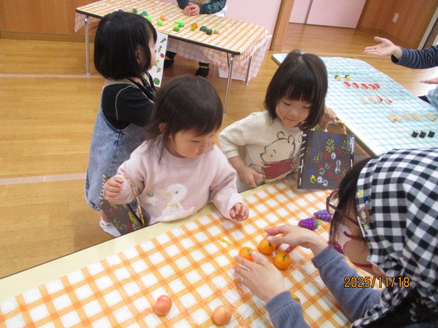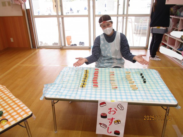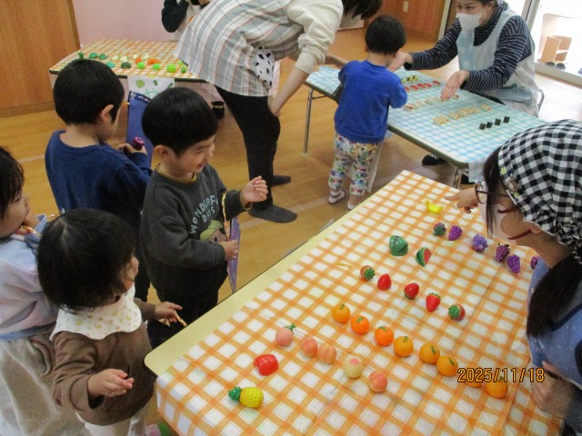 お買い物ごっこをしました♪1回目は、野菜、お寿司、果物と三か所に並べ保育士も気合を入れて店員になります♪そんな姿を見て子どもたちも大興奮!