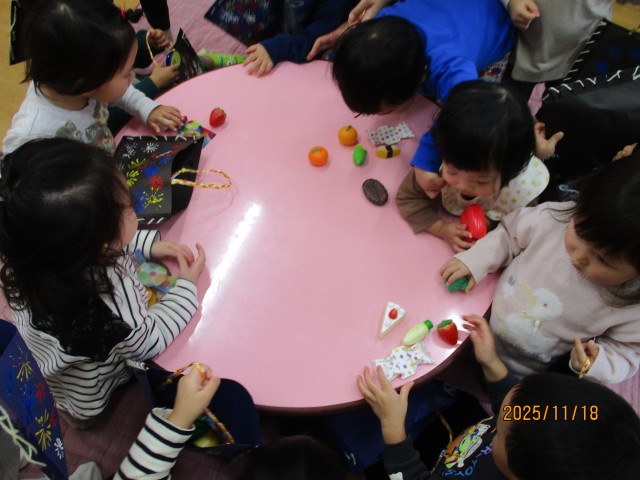 最後は、机やマットの上で買ったものを出し、みんなで見せ合ったり食べたりと、とても楽しんでいた子どもたちでした♪