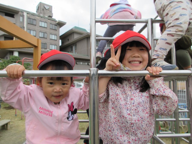 ジャングルジムの隙間から顔をのぞかせてお友達と笑い合う姿が微笑ましかったです。