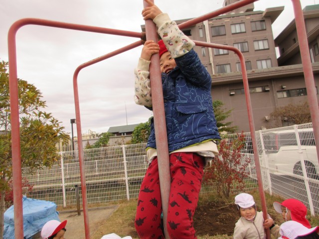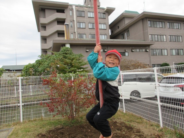 今日は登り棒が大人気!「こうして登るんだよ」「手に力入れて!」と友達同士で登り方を教え合いながら遊んでいました。