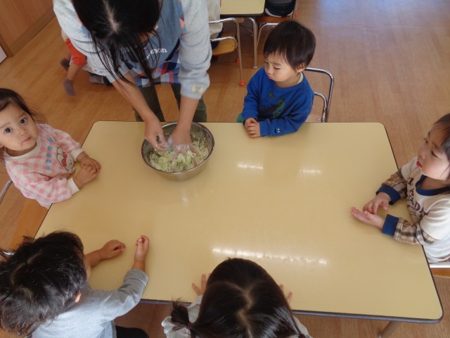 小麦粉粘土が完成すると、「きゃー‼」と嬉しそうな表情や椅子から立ち上がろうとする姿が見られました♪