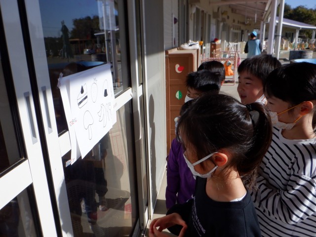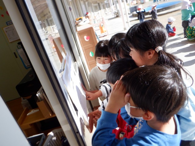 色鬼は「鬼さん鬼さん何色欲しい」と元気に聞いていました♪「茶色」というと土や鉄棒の棒を、「緑」というと葉っぱや砂場のマットを触っていました。掲示板にはいろいろな色があるので、人気でした。