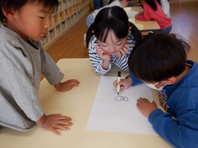 グループ毎に1人ずつ順番に、保育士が描いた絵を見て真似して描いていきました。