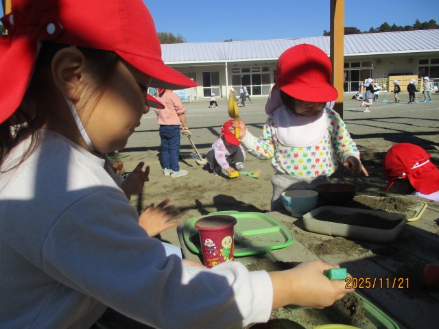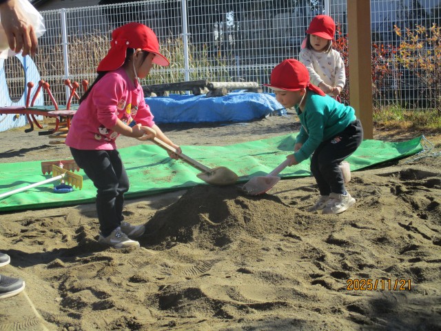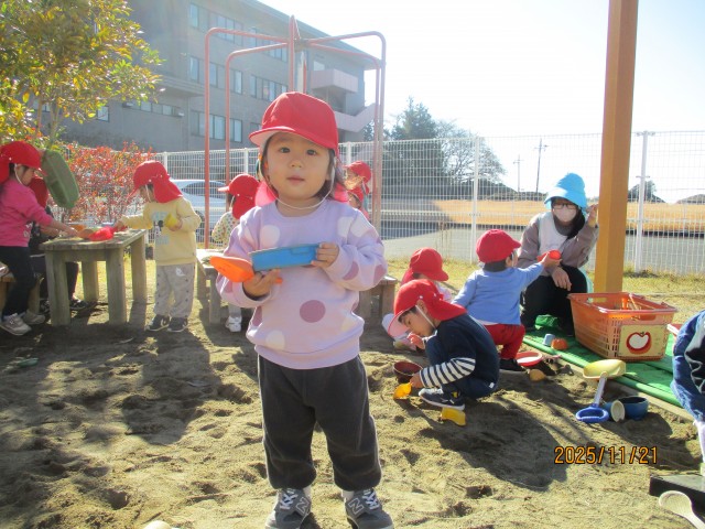 砂場遊びをしました。近くにいる保育士や友達と一緒に料理をしたり、「あ~ん!」と食べる振りをしたりして楽しみました♪また、大きなシャベルを使って山を作ったり、穴を掘って線路を作ったりする姿も見られ、とても微笑ましかったです!