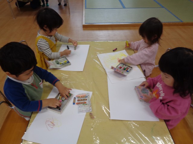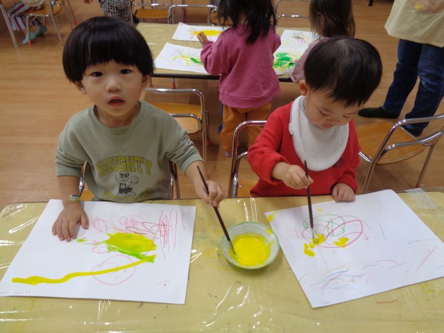その後、黄色や緑の色を使ってクレヨンの上から絵の具がはじく様子を楽しみました♪