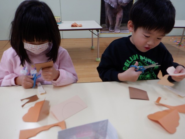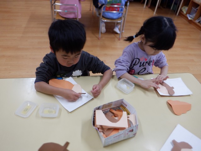 のり貼りをしてパーツをつけたり、折り紙を切って体に模様を付けたりしました。