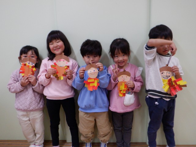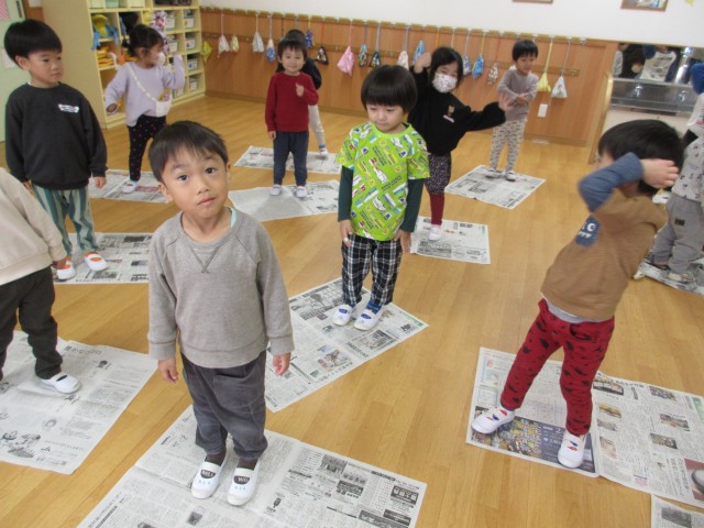 新聞紙ジャンケンでは、「一回も負けないようにする!」「先生には絶対負けない!」と意気込んでいました。ジャンケンで負けてしまうと「悔しい~」と言いながら新聞紙を折る子の姿も見られました。
