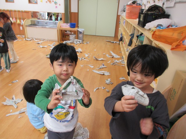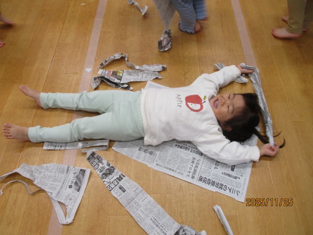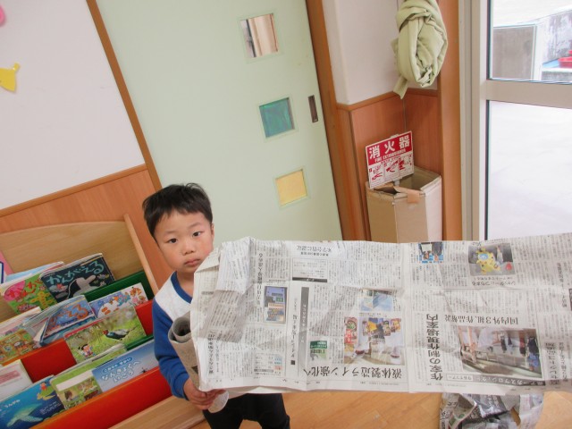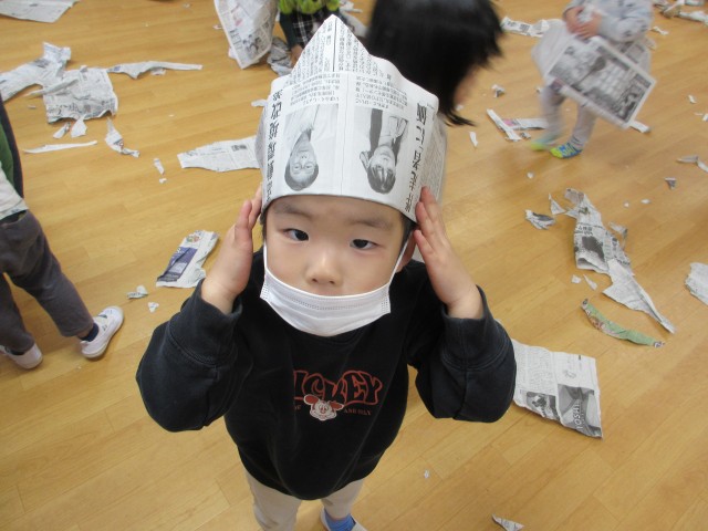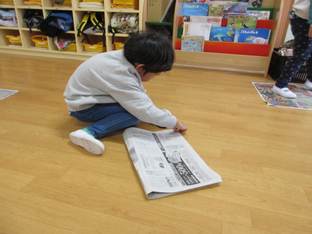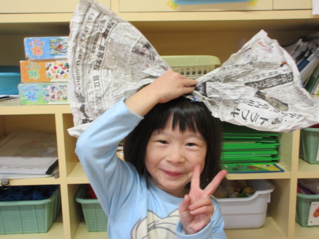新聞紙ジャンケンの後は、自由に新聞遊びを楽しんだゆり組です♪