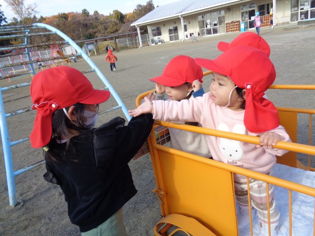 散歩車に乗って園庭散歩をしました。