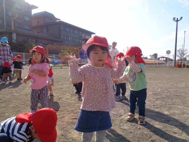 戸外遊びをしました。もも組が体操をしていたので一緒に「ぴ~ぴ~ぱお!」を真似しながら踊ったり、「ストレッ虫」の体操をして体を動かしました。