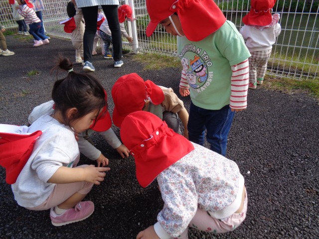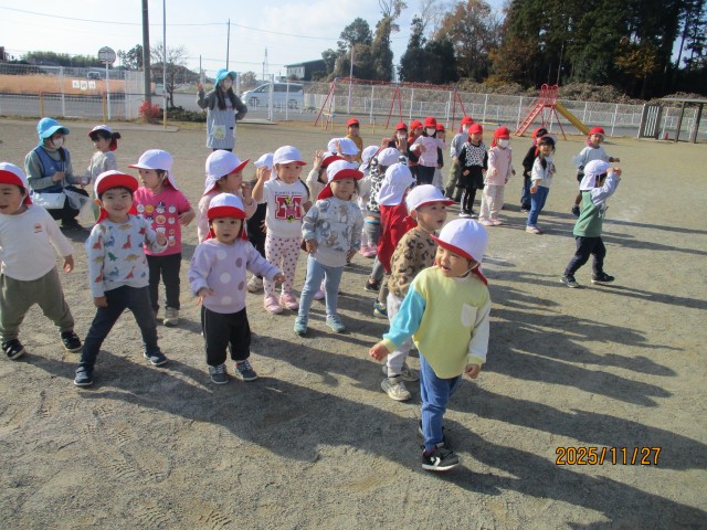 戸外で遊びました。もも組、たんぽぽ組、さくら組が体操をしていたので一緒に「ぴ~ぴ~ぱお!」と「ストレッ虫」を踊りました。