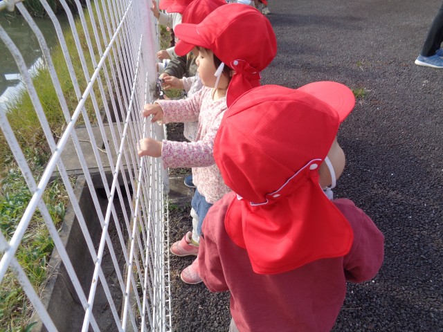 戸外散歩では、池の水を見て指差しをしたり地面に落ちている木の枝を見たりして楽しみました♪