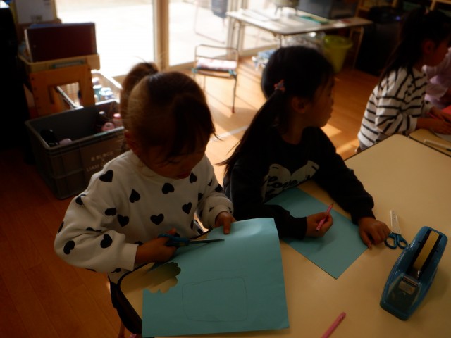 自由工作のコーナーでは、好きな色の画用紙や道具を選び、クリスマスに関するものや、ケータイ、腕時計などを作っていました。